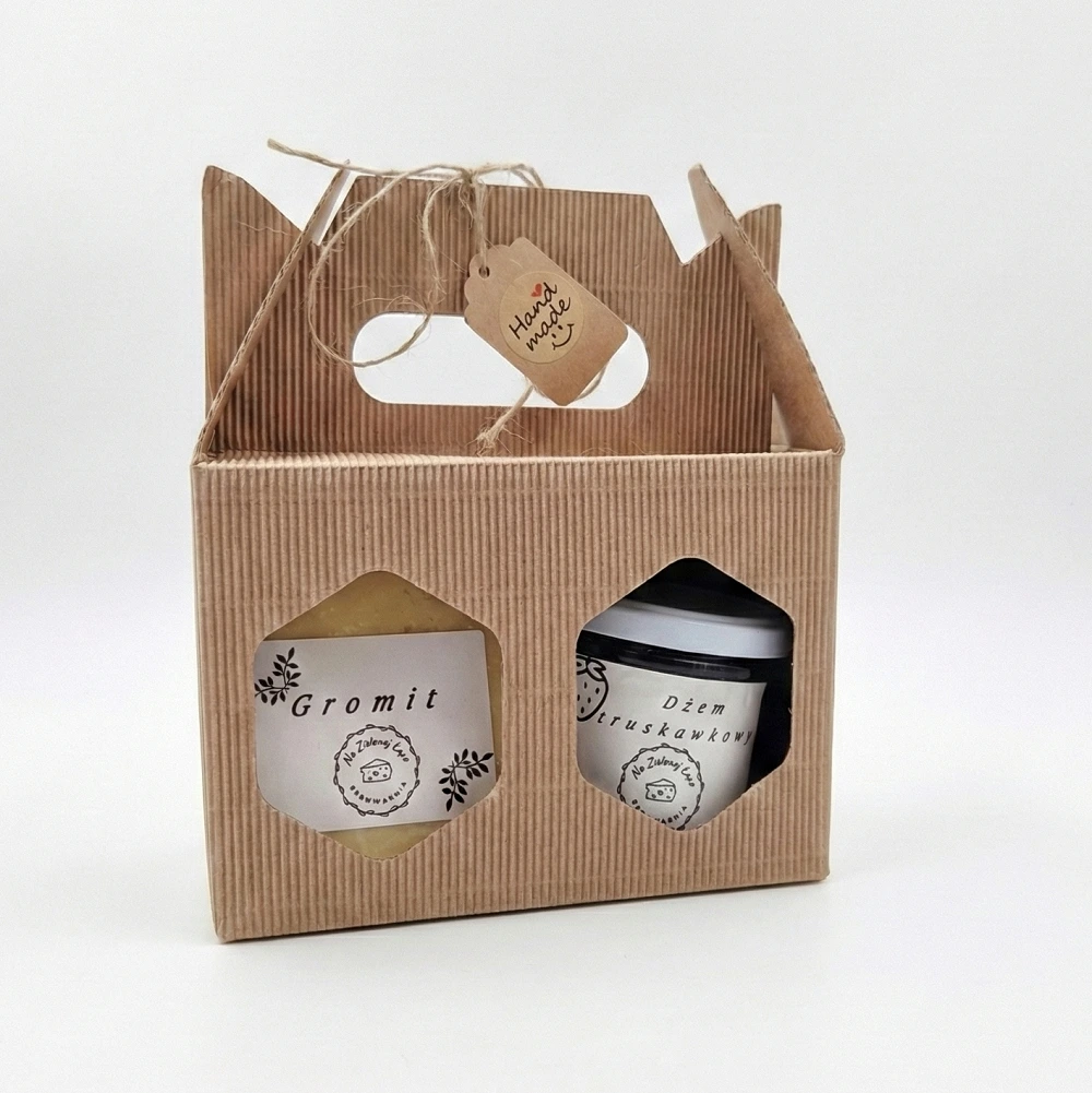 Krowi Gromit z domowym dżemem truskawkowym – rzemieślniczy ser krowi Gromit, wytwarzany tradycyjnymi metodami, o bogatym, wyrazistym smaku i kremowej konsystencji, połączony z aromatycznym domowym dżemem truskawkowym, przygotowanym z dojrzałych owoców, bez sztucznych dodatków.